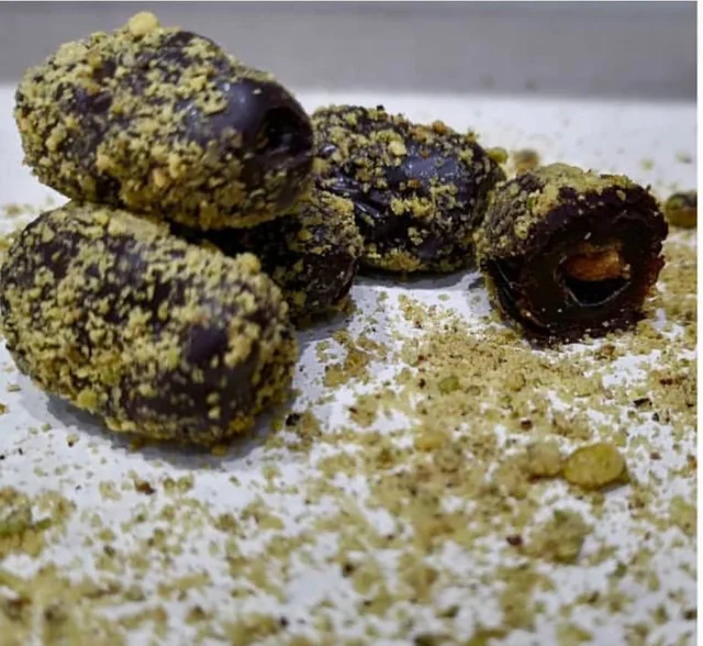 خرماشکلاتی با مغزی پسته و روکش پودر پسته